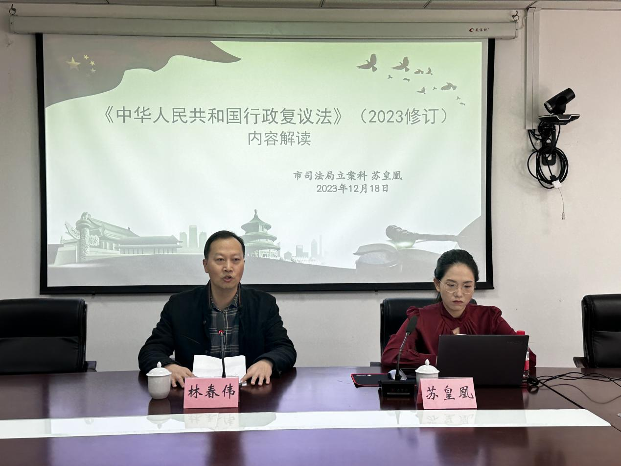 2023年9月1日,十四届全国人民代表大会常务委员会第五次会议审议通过了新修订的《中华人民共和国行政复议法》。为了推进各级各部门深入学习贯彻新修订的《中华人民共和国行政复议法》,切实把握其立法本意和丰富内涵,日前,泉州市司法局、市行政服务中心管委会邀请泉州市司法局四级主任科员苏皇凰同志作专题培训,泉州市司法局立案科科长林春伟主持培训。